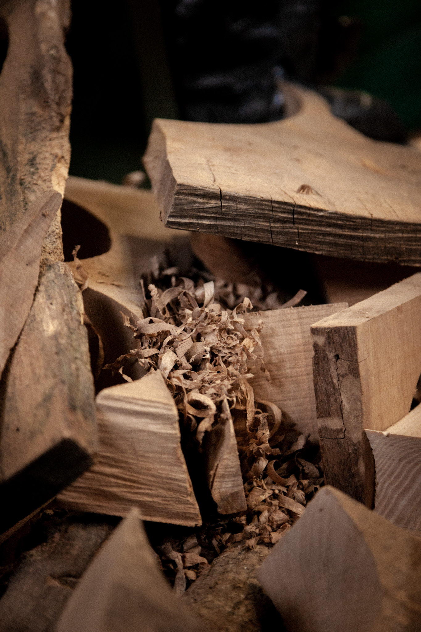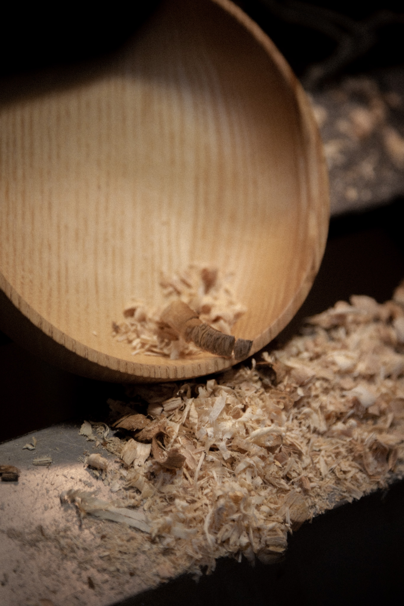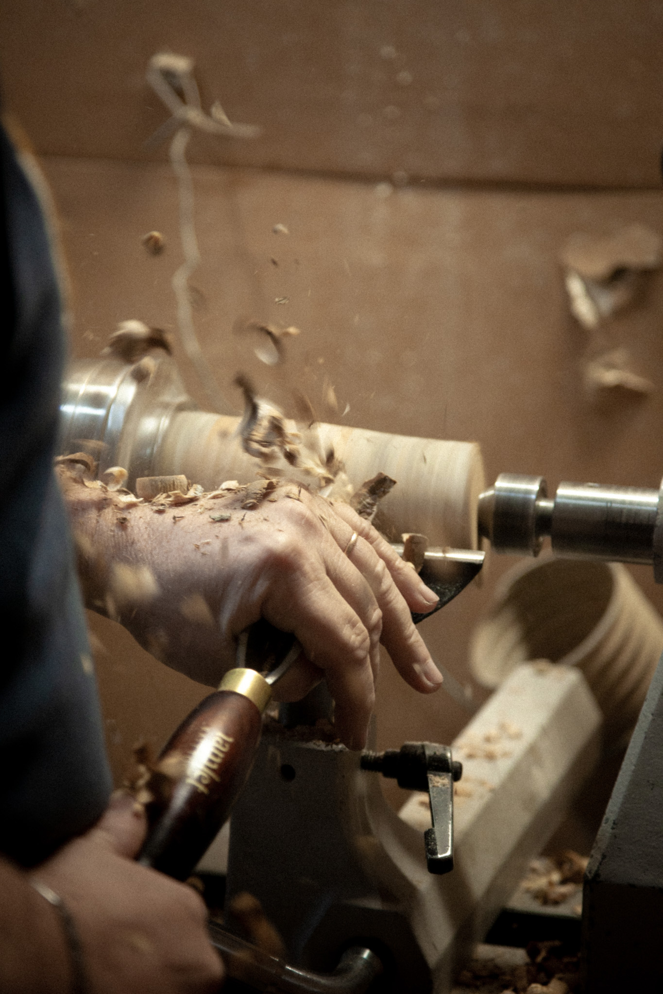 Dans son atelier, la première chose qui vous interpelle, c’est l’odeur du bois travaillé. Et si vous avez la chance de le voir créer, vous serez témoin de la valse des copeaux, du cri du bois, du ronronnement du tour et le parfum de la matière façonnée, un voyage sensoriel.